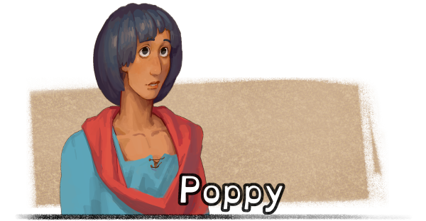 Poppy is our heroine. As a transgender woman, she starts out not knowing she's trans, but realizes and comes out partway through the story. She appears in the demo using her birth name, 'Dorman', and he/him pronouns.